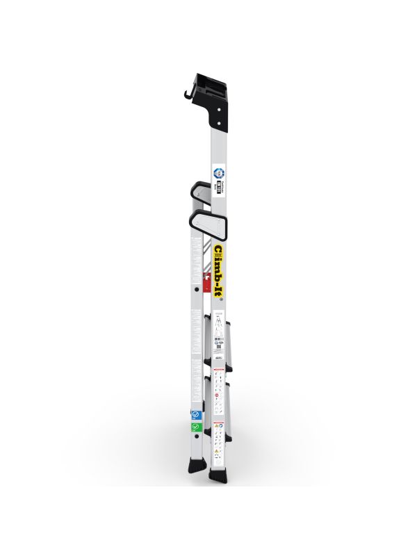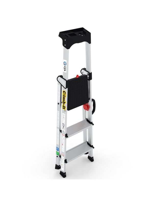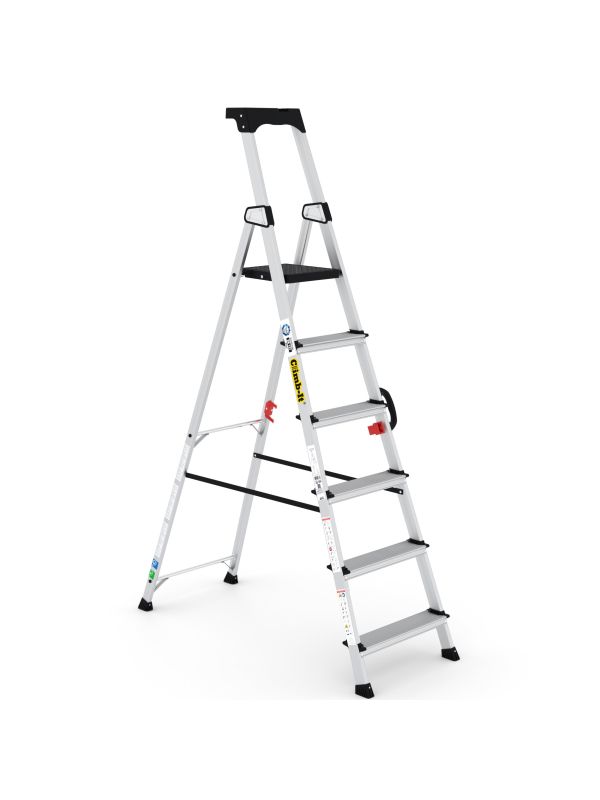 Climb-It Professional Aluminium Step Ladders redefine workspace safety. These EN 131-certified folding step ladders feature a lightweight aluminium frame and a glass fibre-reinforced polypropylene platform for long-lasting performance. The 100mm wide serrated treads are designed to prevent slips, offering enhanced security when working at height.