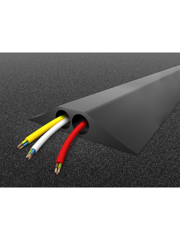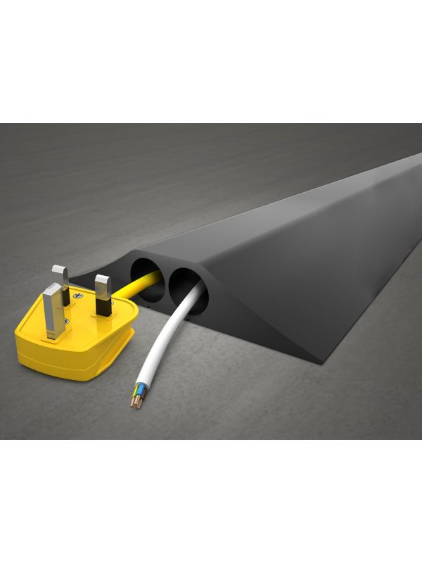 The heavy duty rubber cable protector features tough ramped edges that shield cables from impact and abrasion. With a 1500 kg load capacity and large 23 mm channels, it prevents cable damage while maintaining smooth surface access for vehicles, trolleys, and equipment.