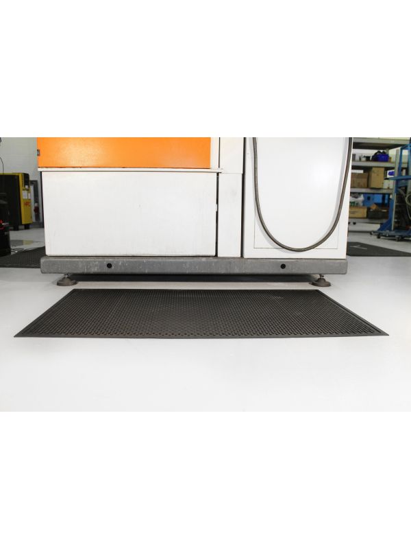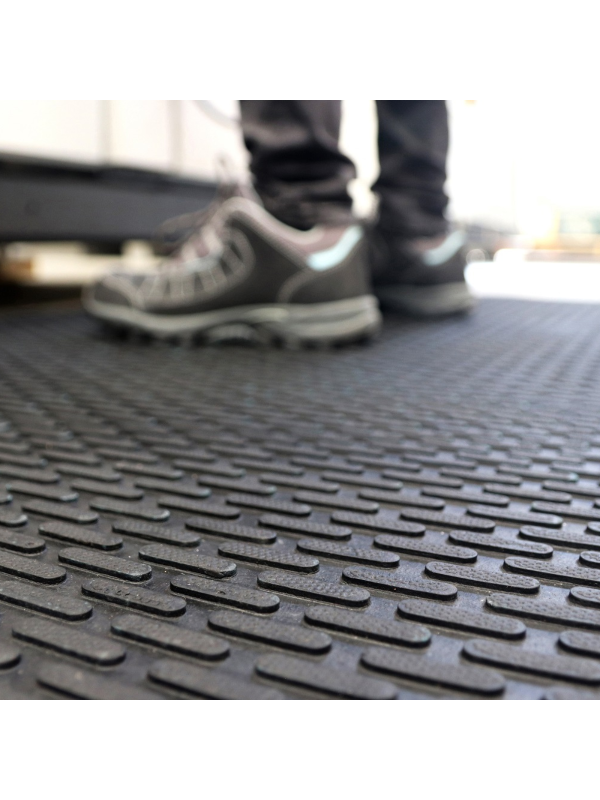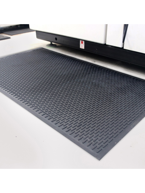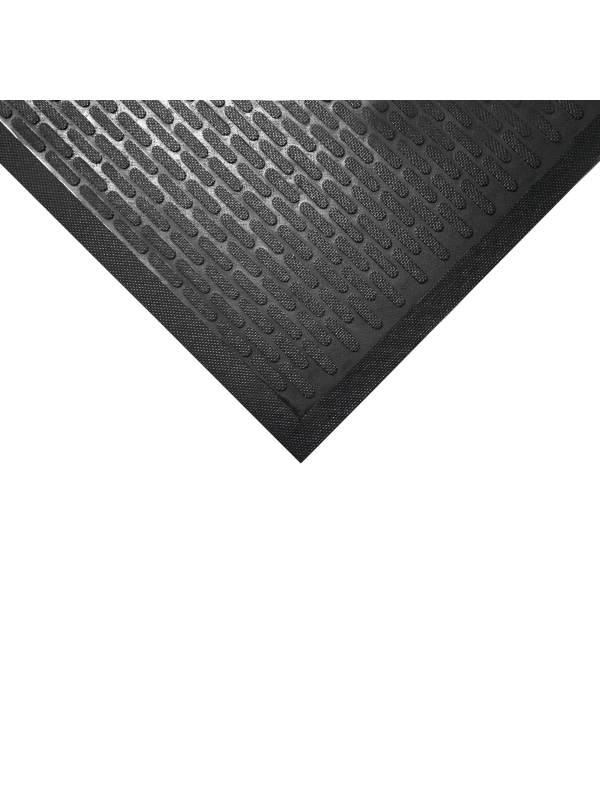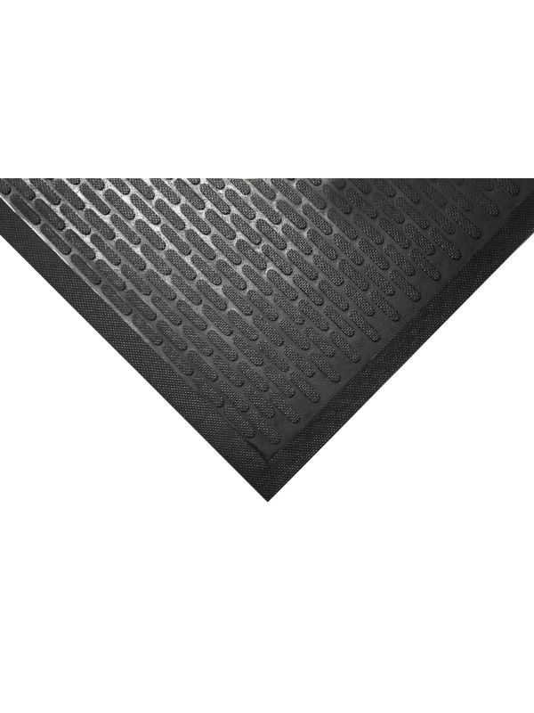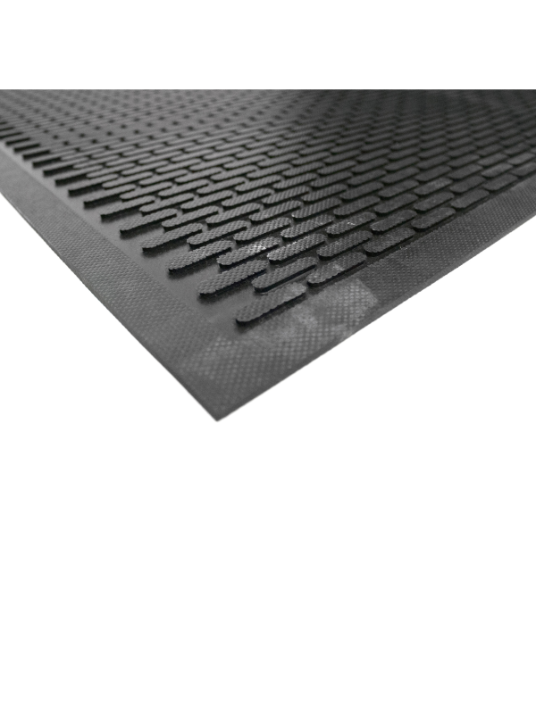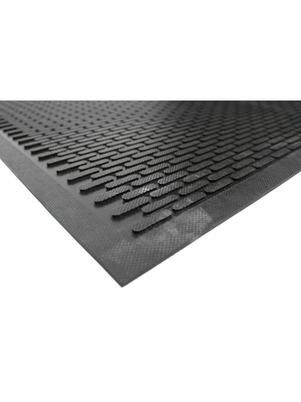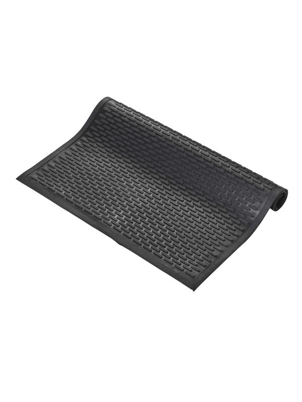 Featuring a solid NBR rubber surface with raised rectangular cleats, the mat scrapes dirt and debris from footwear while trapping up to 2.6 litres of water per m² or 1.5 kg of dry dust per m². Its bevelled edging helps prevent trip hazards, making it a safe, practical choice for industrial entrances, kitchens, and food manufacturing areas.