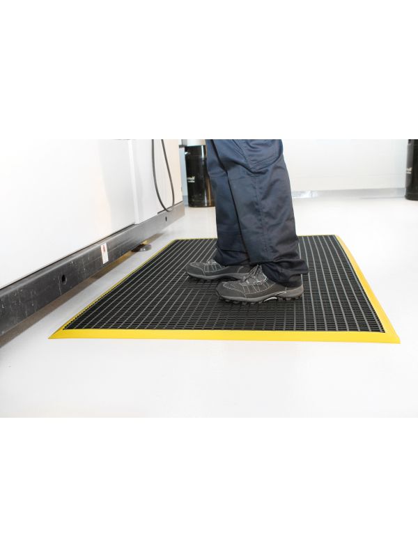 The cross-ribbed surface in both directions offers excellent grip, reducing slip-related accidents even in wet or oily conditions. Its open weave design traps debris effectively, keeping the surface safe and clean. The yellow bevelled edging enhances visibility and helps reduce trip hazards in busy work areas.
