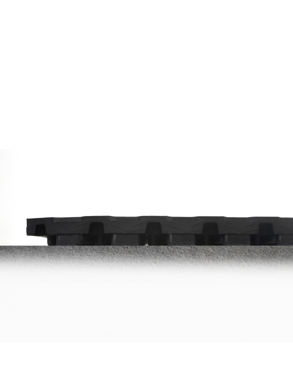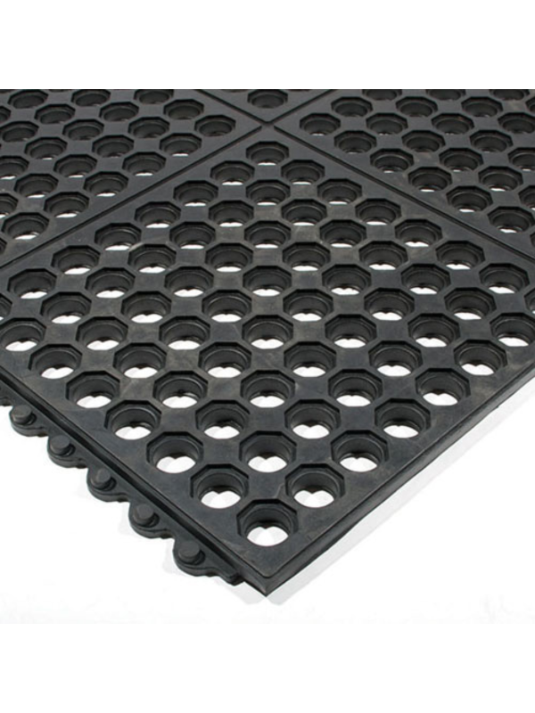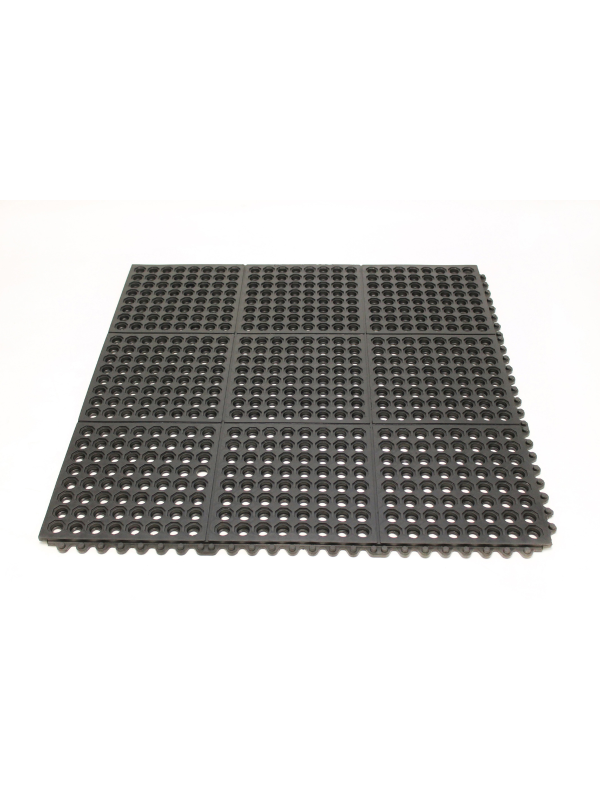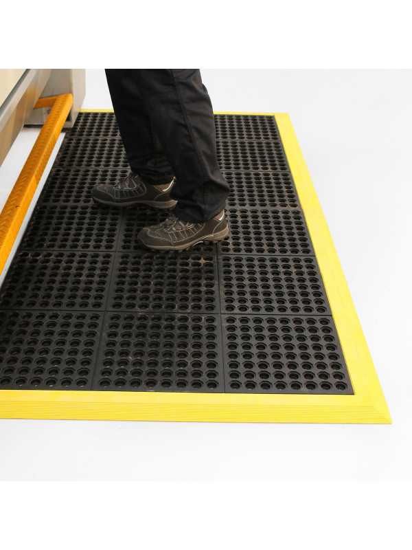 Each tile is constructed from a resilient industrial rubber mat with a textured, anti-slip surface tested to DIN 51130 standards, reducing the risk of slips and falls. The design promotes both comfort and stability, relieving strain from standing or walking over long periods.