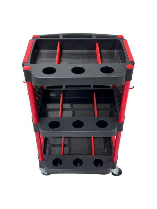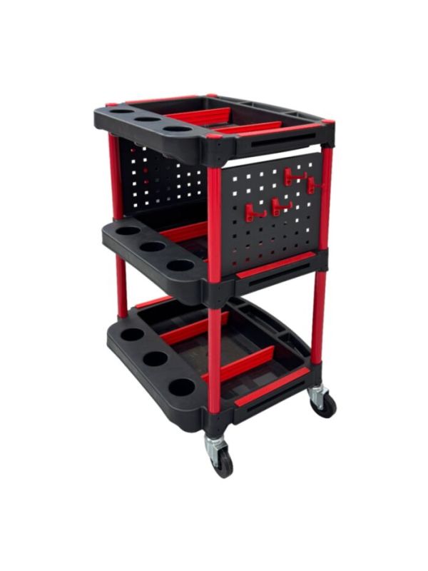 Designed for flexibility, it includes removable shelf dividers, peg boards, and hooks, allowing users to customise their storage space to keep tools tidy and accessible. Mobile on four 100mm swivel castors, two of which have brakes for added stability, the trolley supports a total load of up to 100kg evenly distributed.