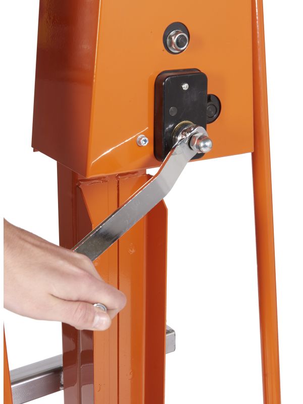 This manual model is operated via a hand winch and features an auto brake system for safety and control. The unit is mobile on 125mm steering wheels with foot guards and 75mm rollers, ensuring easy movement and positioning in tight spaces.